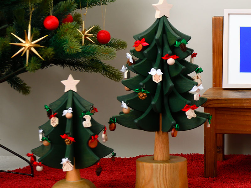 クルミやトチ、ナラ、シナなど、日本の木でつくられた、ツリー型オルゴール。日本の森を活かすという目的のもと、国産の広葉樹を積極的に使用しおもちゃづくりを行っている「オークヴィレッジ」からの贈り物です。