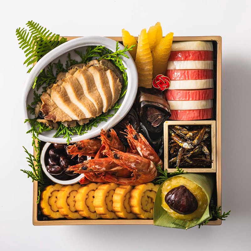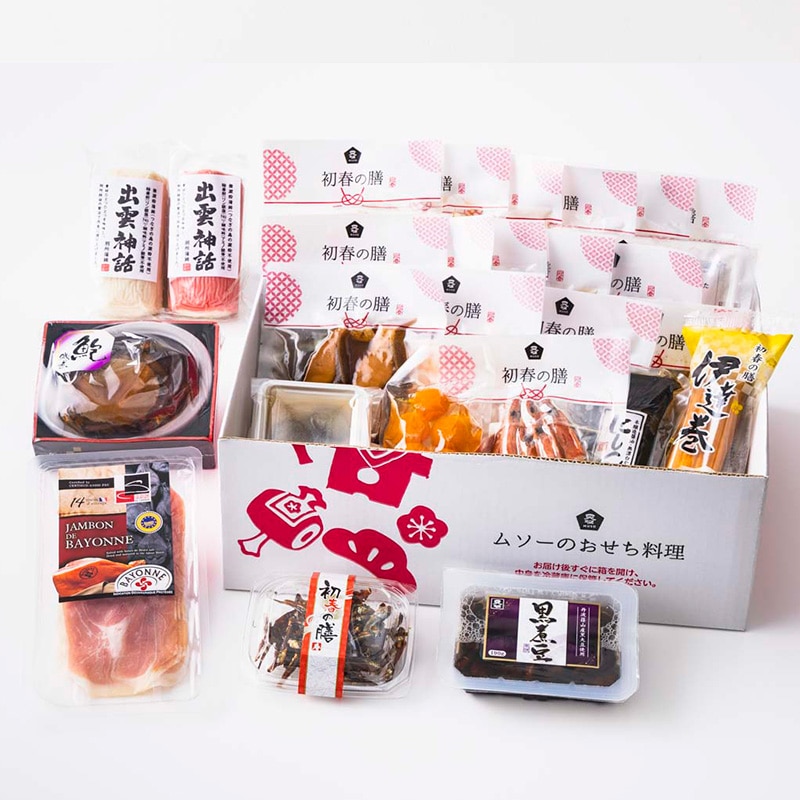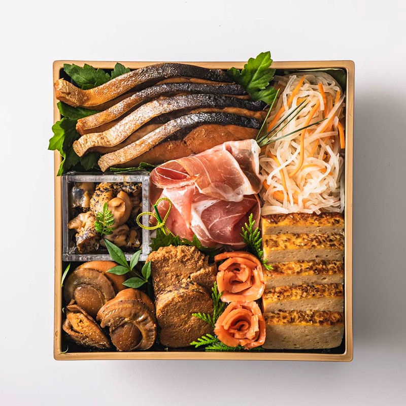 ●北海道産秋鮭スモークサーモン:40g×2 ●鶏の味噌松風焼き:90g ●国産天然鰤のいしる煮:5切 ●北海道産真鱈の子うま煮:80g ●北海道産つぶ貝うま煮:60g ●紅白なます(国産有機野菜使用):100g ●フランス産生ハム:40g ●北海道産帆立貝うま煮:5個