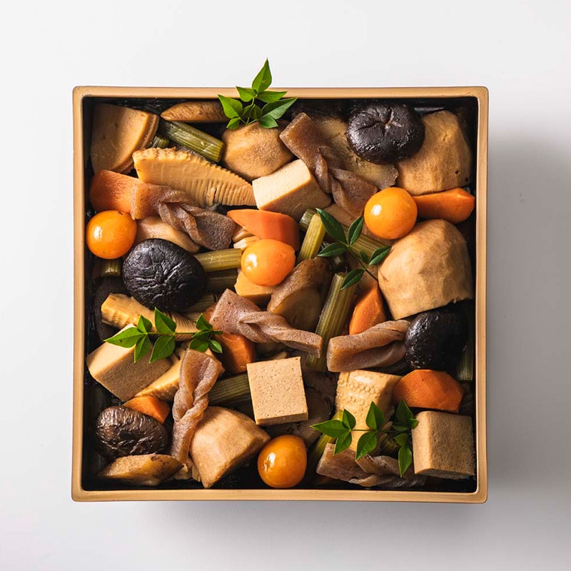 ●国産椎茸の含め煮(国産原木栽培椎茸使用):5枚 ●国産ふきの煮物:100g ●煮しめごぼう(国産有機ごぼう使用):80g ●国産竹の子土佐煮:80g ●里芋含め煮(国産有機里芋使用):100g ●高野豆腐の含め煮(国産有機大豆使用):2枚 ●にんじん含め煮(国産有機人参使用):100g ●手綱こんにゃく(有機こんにゃく芋使用):10個 ●九州産金柑の甜菜糖煮:5粒