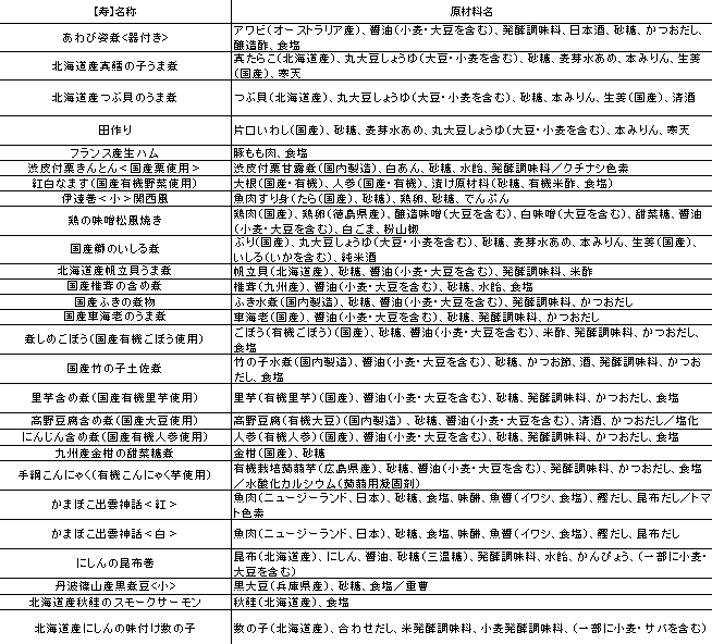 ●かまぼこ出雲神話・紅:1本(180g) ●かまぼこ出雲神話・白:1本(180g) ●伊達巻・小<関西風>1本 (160g) ●北海道産にしんの味付け数の子:4本 ●丹波篠山産黒煮豆<小>:100g(内容総量190g) ●国内産車海老のうま煮:5尾 ●田作り:40g ●渋皮付栗きんとん(国産栗使用):150g ●にしんの昆布巻:1本 ●あわび姿煮〈器付き〉:約60g