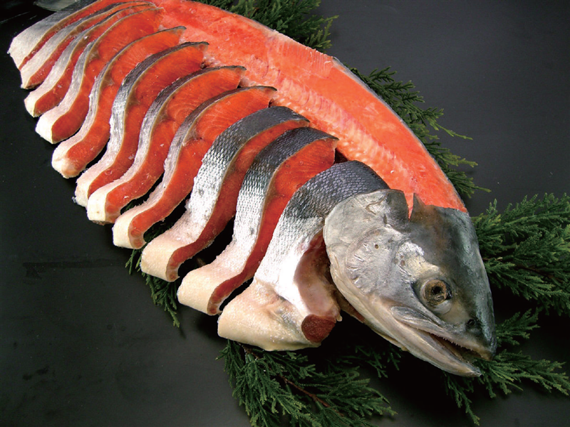紅鮭の中でも極上品と呼ばれる北洋産紅鮭です。北洋の海を回遊している若い状態の紅鮭を厳選しているので、身の締まりと適度な脂ののりがあり、紅鮭のうまさに必要な特徴をすべて兼ね備えています。