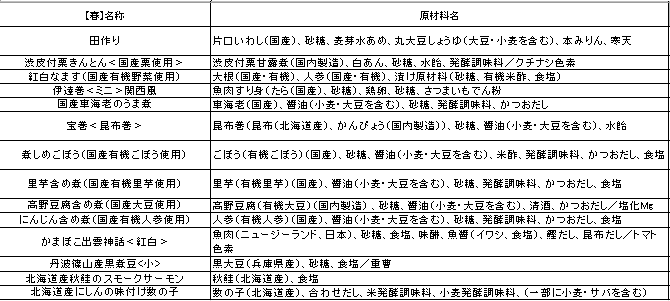 ●宝巻〈昆布巻〉:90g ●紅白なます(国産有機野菜使用):100g ●煮しめごぼう(国産有機ごぼう使用):80g ●里芋含め煮(国産有機里芋使用):100g ●にんじん含め煮(国産有機人参使用):100g ●高野豆腐含め煮(国産有機大豆使用):1枚