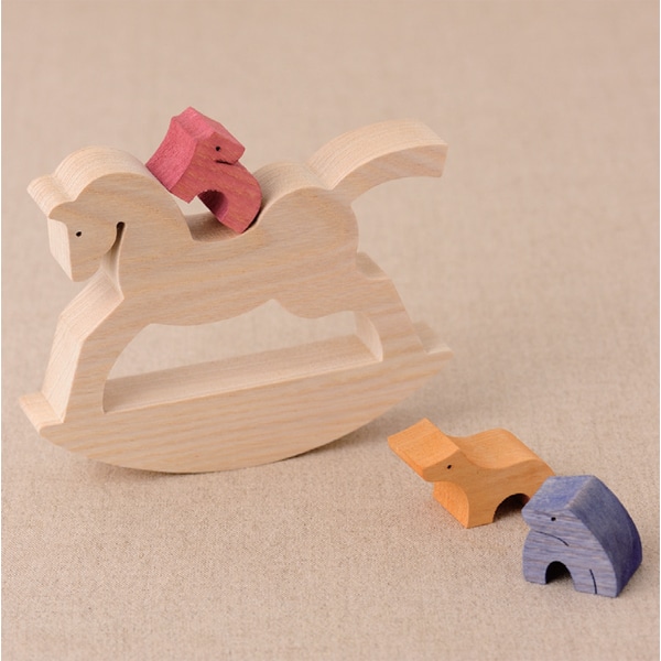 長年、組み木の人形をつくり続けている小黒三郎さんは、その年その年の干支の組み木もデザインし続けています。見てたのしむのはもちろん、あそべる組み木。4ひきの馬を組みかえて置いてみるだけで、そこからさまざまな物語が生まれてきそうです。