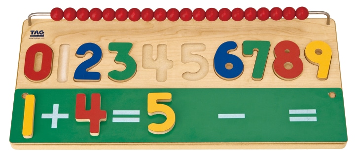 数字パズルと20個のビーズ玉、移動が可能な点線で数字をなぞるパターンの付いたチョーク板、さらにたし算、ひき算練習板から構成されている、数えるための学習準備(レディネス)がセットされた遊びです。数の名前と数えることを学び、抽象的な数とその量の関係を理解します。数字を書き、たし算、ひき算の練習も行います。