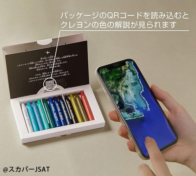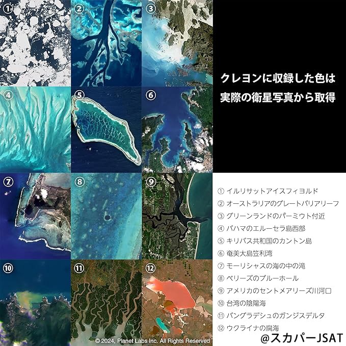 世界中の海の衛星写真の中から12枚を選び、その色から作られたクレヨン。