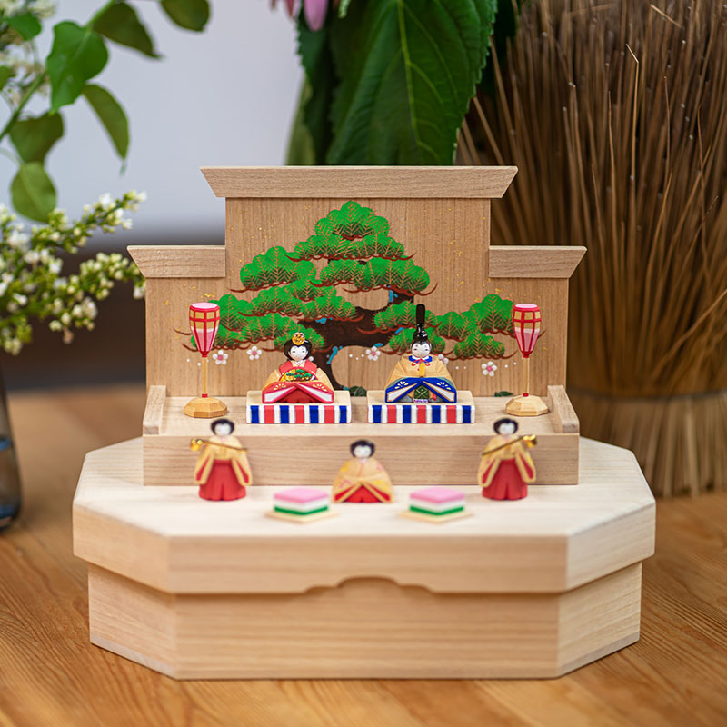お内裏様と三人官女とのセットになります。八角形のかわいい桐箱に全て納まります。