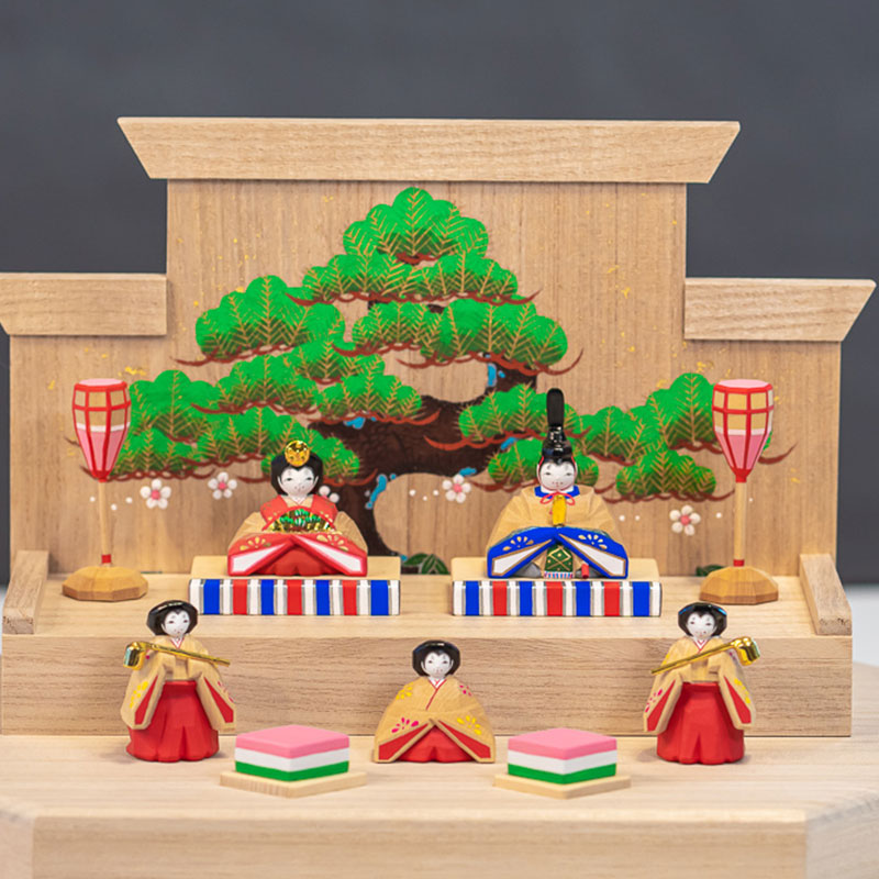 江戸時代以降は公武上下を問わず、上巳を祝う女性の節句として盛んに行われるようになりました。 特に享和年間(180年ほど前)に江戸の人形師・原舟月が、俗に内裏雛といって男は束帯、女は十二単を着せて、雲上を模すようになりました。 また、これにしたがい三人官女、五人囃子などいろいろな人形も飾るようになり、いまの人形の形式が確立されました。