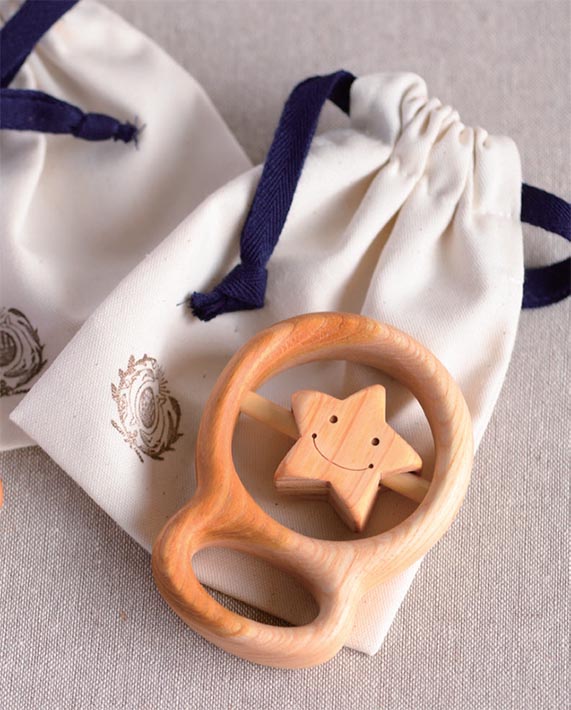 さわり心地バツグン! あかちゃんがものをつかむ力がついてきたら大活躍するのが、握ってあそぶおもちゃ。山のくじら舎の「カタカタ」は、左右に振ると、星や月をモチーフにした部分が丸い枠に当たり、カタカタとやさしい木の音が響きます。片面に目と口がついている星や月のモチーフをクルクルと回転させると、顔が見えかくれし、「いないいないばあ」あそびとしてもたのしめます。仕上げは、天然の亜麻仁油を使用。歯固めとしても使えます。高知県にあるおもちゃ工房「山のくじら舎」は、県内の木材を使用して、すべて手づくりで製造しています。