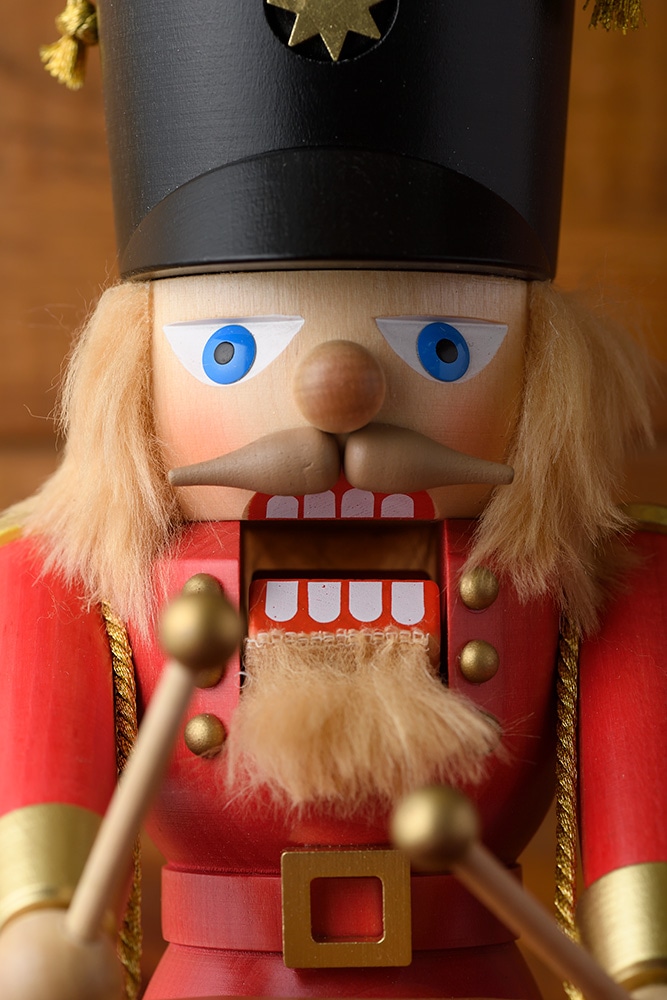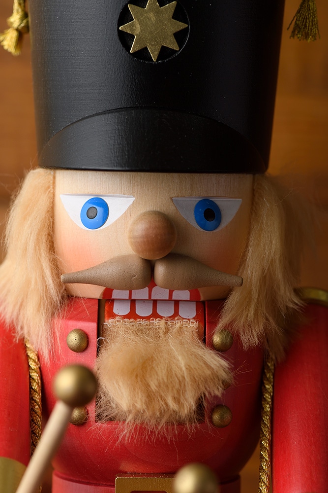 背中にあるバーを上げると口が大きく開く、くる み割り人形。王様や兵隊、警官などの権力者 に対して「かたいものを噛ませて口を封じてしま え!」という風刺の意味も。