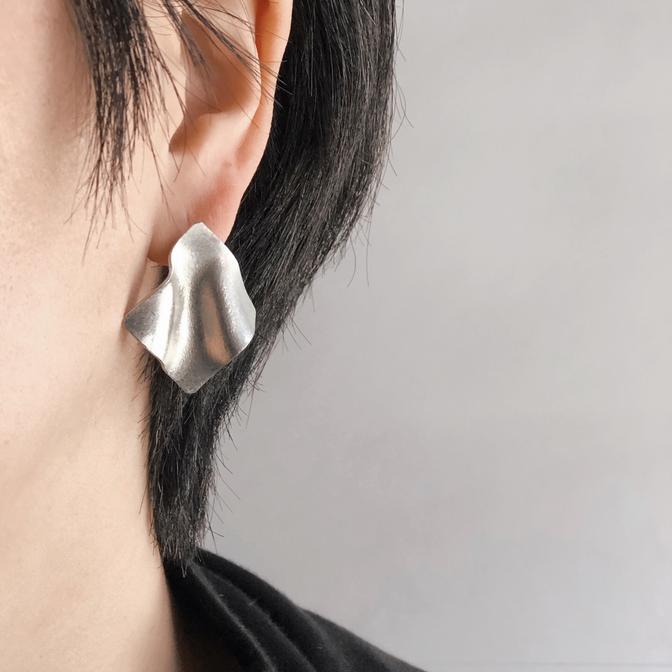 錫(すず)でつくったイヤリングです。 柔らかい錫を曲げることで、美しい波打った形状をつくりました。シンプルながら存在感のあるデザインです。