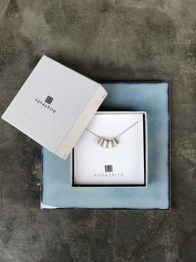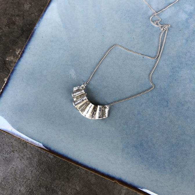 錫をドレープ状に折り曲げて作ったネックレスです。 小さくシンプルながら他にはないデザインです。 長めにするとタートルの上からも装着できます。