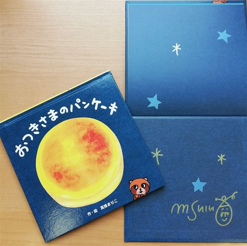 「まんまる おつきさま おいしそう たべたいなぁ」と、たぬきがじっと満月を見つめていると、とろとろとろーり……なんと、おつきさまが垂れ下がってきました。バターを敷いたフライパンで垂れてきたおつきさまを受け止めて、ジュージュー焼いて、ぷつぷつっと泡が立ってきたら、ひっくり返して……できあがり! 思わず食べたくなるほどおいしそうな、おつきさまのパンケーキです。