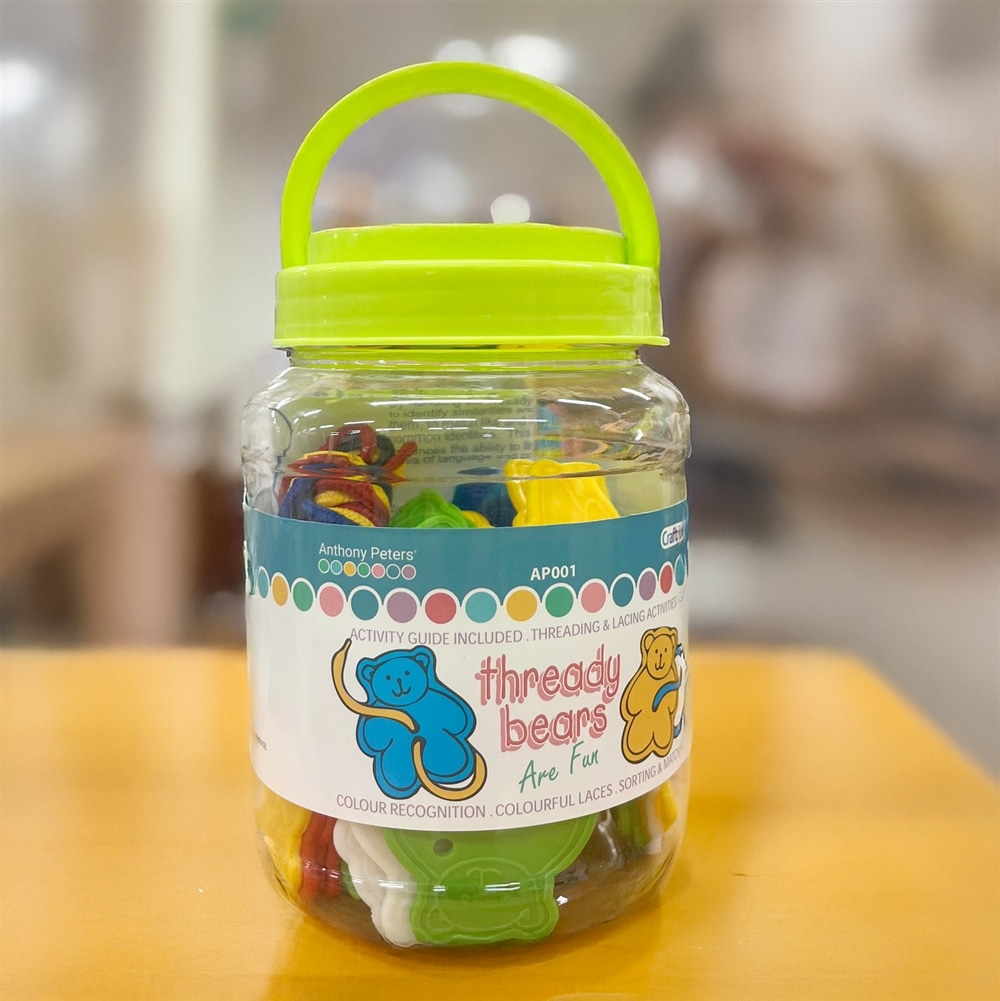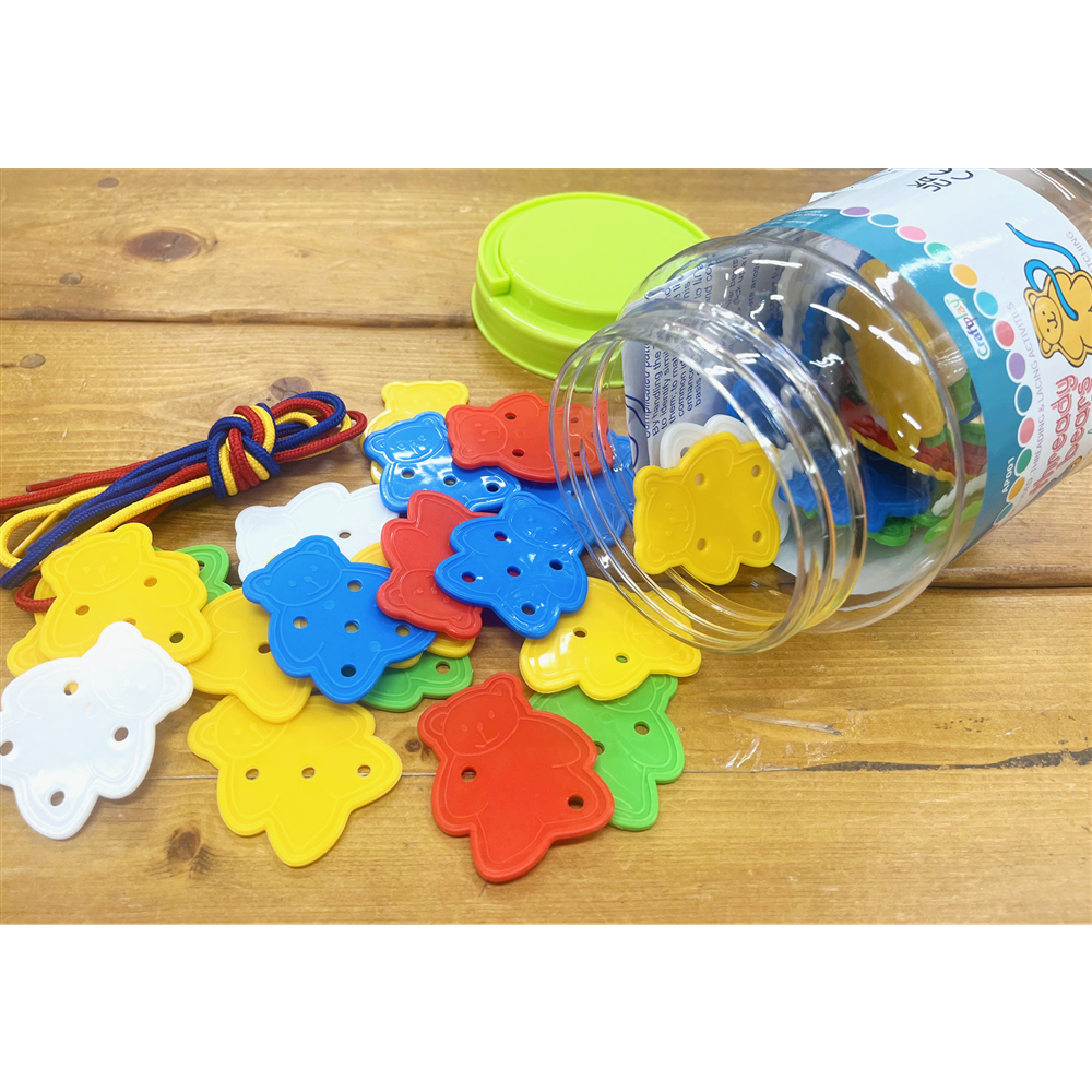 5色のくまのおなかには1つ~5つの穴が開いています。 穴は比較的ちいさいので、3歳くらいからの紐とおしですが、色ごとに並べたり、穴の数で分けたりしても。 キュートなくまモチーフが50個も入っているので、バラバラーッと広げるだけでもたのしいあそびになります。