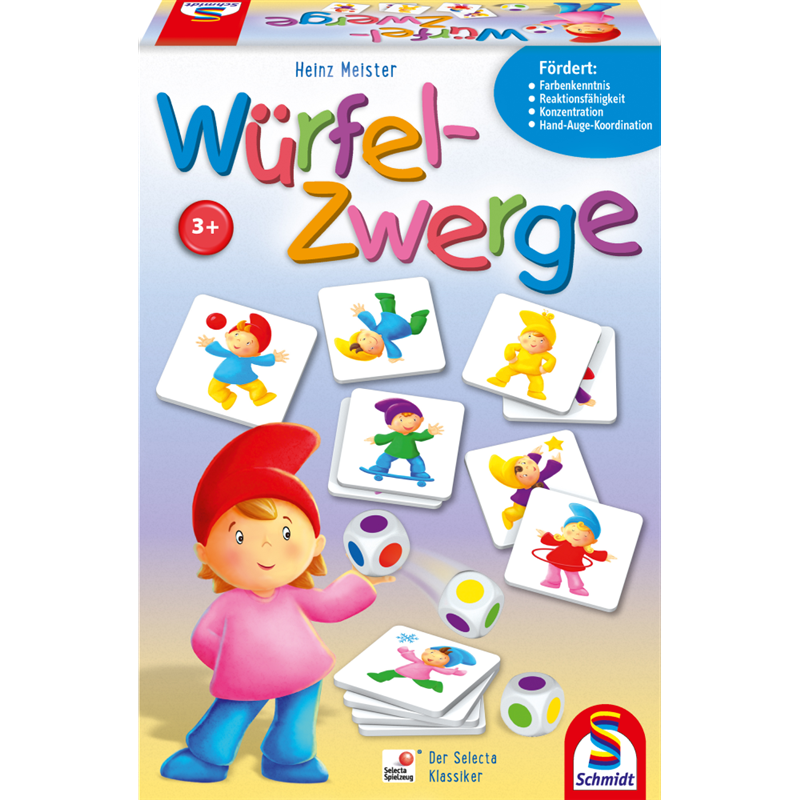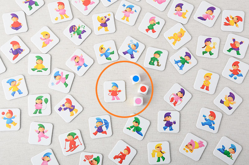 いろいろなポーズをしている妖精たちが、全部で56人。みんな帽子、上着、ズボンの格好ですが、色の組み合わせはさまざまです。さぁ、ここで6色の目がある3つのサイコロの出番です。3つ同時に振って出た色をよーく見て。同じ色の組み合わせの服を着ている妖精を探して、すばやくカードを取りましょう。場にカードがなくなったときに、持っているカードが多いひとが勝ちです。 シンプルな色合わせのゲームですが、なかなかカードが見つからないときも。 ●カードゲーム ●対象年齢:3歳くらい~ ●参加人数:2~8人 ●所要時間:約10分 ちいさい子はサイコロの数を減らしたり、ルールを変えたりしながら、カードを探すあそびでたのしむのもいいですね。