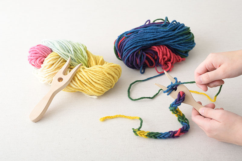 指を使って編む、初心者におすすめのY字リリアンは、3-4歳頃からたのしめます。太めの毛糸を使ってゆるめに編んだり、糸の種類を変えてみたりして、工夫しだいでおもしろいひもができます。毛糸も段染めで、編みあがりがきれいです。