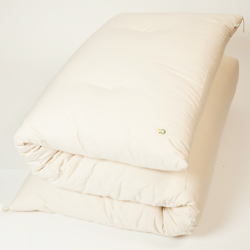 生地、縫い糸、おふとんの中綿まで、すべての素材が純オーガニックコットン100%を使用し、熟練のお布団職人さんが一つひとつ手作りするお布団です。栽培から製造工程に至るまで、天然自然の温もりとやさしさを大切につくっているため、夏は空気を通して涼やかで、冬は保温性がたっぷりです。