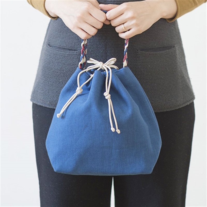 洋服にも和装にも。手編みの持ち手がかわいい、ころんと丸い巾着バッグ