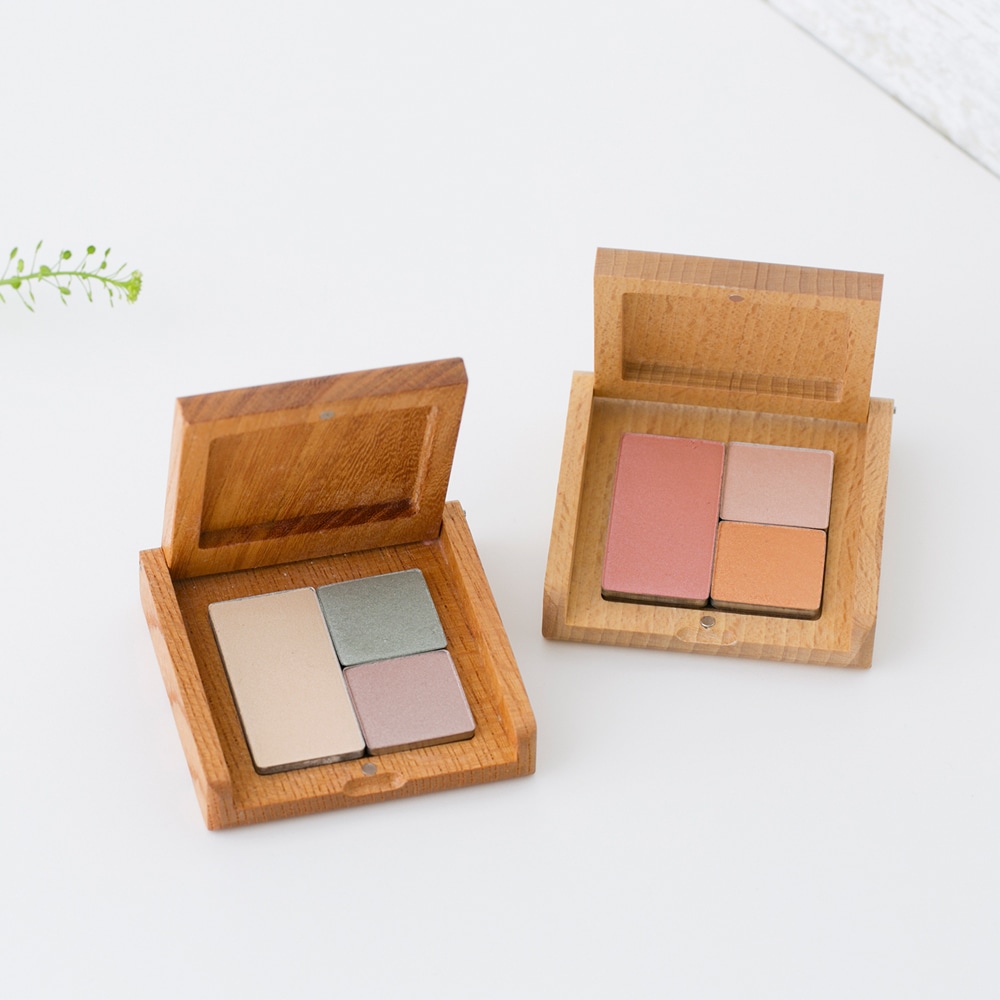 チーク、ハイライター、アイカラーの好きなカラーを選んで、木製のパレットにセット。無駄がなく、環境にやさしい、パレットシステムです。