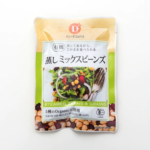 豆の美味しさを逃さず閉じ込めた、こだわりの蒸し製法 有機のお豆が5種類(ひよこ豆、大豆、青エンドウ、赤いんげん、黒いんげん)入った、だいずデイズのミックスビーンズ。それぞれの豆が最適な柔らかさに蒸し上げられ、選びぬかれた塩と有機米酢で味付けされており、そのまま食べてもとても美味しいです。シンプルなレシピのサラダやスープの彩りをよくしてくれて、栄養もたっぷり補え、家族みんなでたのしめます。常備菜として、また、災害時の備えとしても役にたってくれそうです。(東京店野菜市場・S)