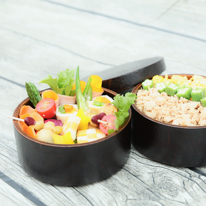 職人が一つひとつ木をくり抜いてつくっているので、継ぎ目がなく汁漏れの心配もありません。天然漆を塗装しているので、水や油に強くお手入れしやすいのも魅力。1段、2段と重ねて使っても、食卓に器として並べても粋です。