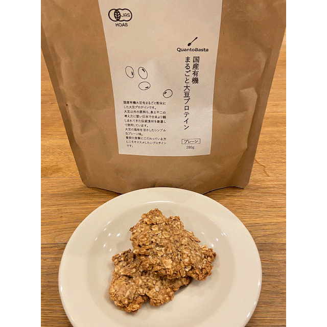 国産有機大豆プロテインで、栄養満点クッキーを 植物性の大豆プロテインは、近年、健康維持や美容、運動をされる方の栄養補給にと大人気。 クアントバスタさん(QuantoBasta:イタリア語で「適量」)の大豆プロテインは、 国産有機大豆をまるごと粉砕、有機黒糖、有機米糀、乳酸菌などで自然な甘みを感じられる美味しいプロテインです。 でも毎回、豆乳や牛乳に混ぜて飲んだり、ヨーグルトにかけていただくだけでは飽きてしまう……? わたしのおすすめの食べ方は、薄力粉の代わりに大豆プロテインを入れて作るオートミール&プロテインクッキー。 材料を混ぜて焼くだけでヘルシー&栄養たっぷりのクッキーを簡単に作ることができます。 スポーツに熱中しているわがやの男子にも、安心して食べさせられる!とはじめました。 成長期の子どものおやつにはもちろん、おとなにもうれしいギルティフリーなクッキー。おすすめです。 (東京店野菜市場 M)