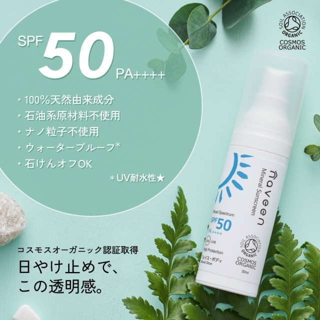 ナヴィーン日焼け止めの特長 ・100%天然由来の成分 ・石油系の原料不使用、酸化亜鉛不使用 ・肌にむらなくつけやすい伸びのよいテクスチャー ・ウォータープルーフ仕様 ・保湿成分・肌を整える美容成分(ひまわり種子ロウ)配合 ・台湾のメーカーではじめてコスモオーガニック認証を取得