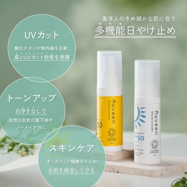 NEW! ナヴィーン NAVEEN 肌を整えてツヤ肌に魅せる日焼け止め ブルーベリーオイル配合(保湿) 天然由来100%の日やけ止め。 伸びの良いミルクタイプ。 アロエベラエキスなどの植物由来のエキスで肌を保湿しながら、自然にトーンアップしてくれます。 ウォータープルーフ仕様。 6歳以上のお子様からご使用いただけます。 石けんでオフできます。 ※こちらの商品は色なし(白色)のクリームです。