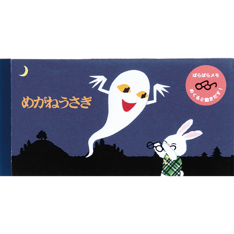 ロングセラー絵本『めがねうさぎ』のぱらぱらメモ。メモをめくっていくと、めがねをさがすかわいいおばけの姿が……絵本の世界観が表現されたメモパッドです。
