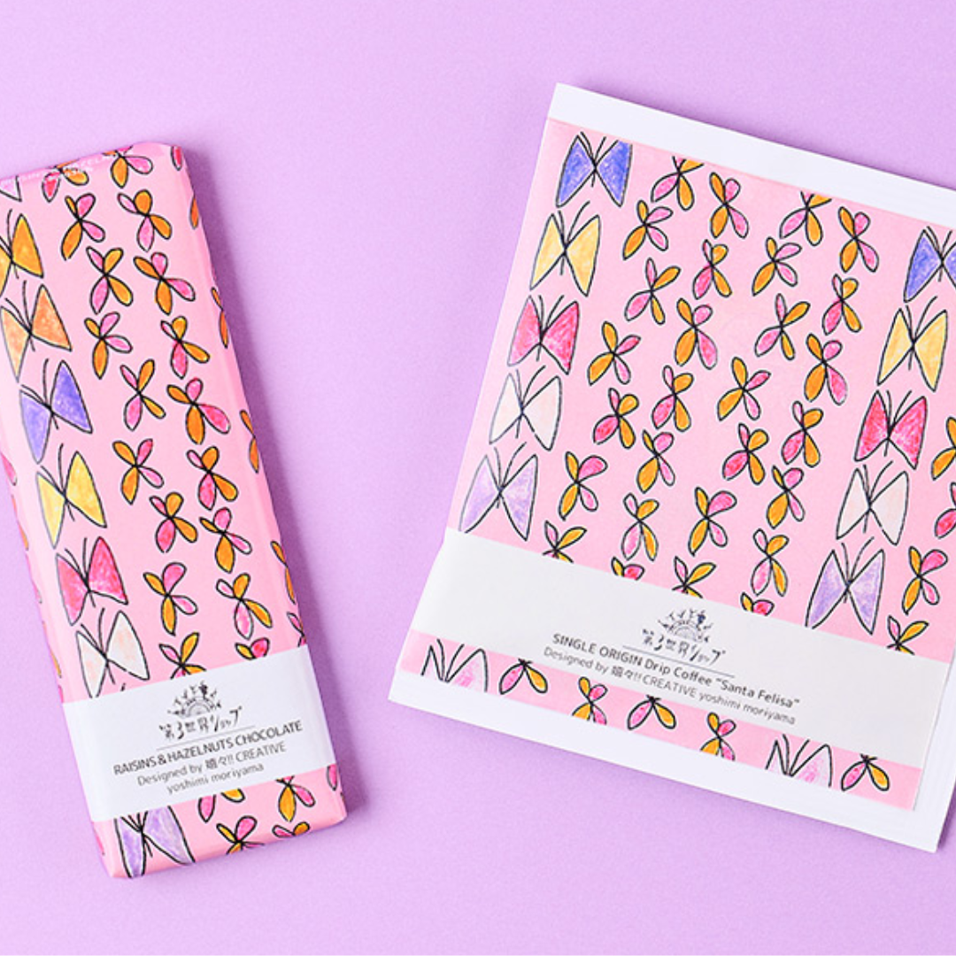 森山 幸美さんの「蝶々とお花」のアートワークがデザインされたパッケージ。