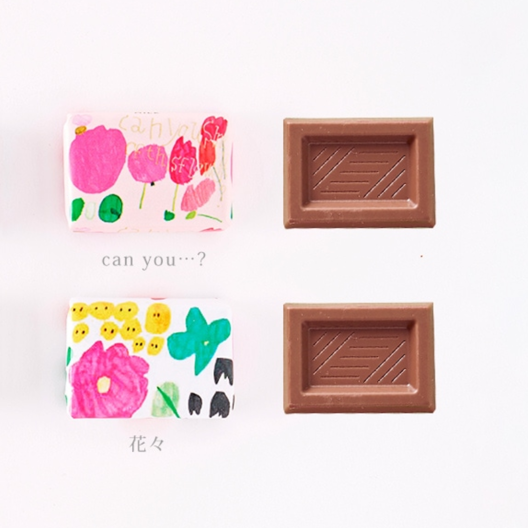 中身のチョコレートは「花々」と、箱とお揃いの「can you…?」の2種類のアートワークがデザインされています。