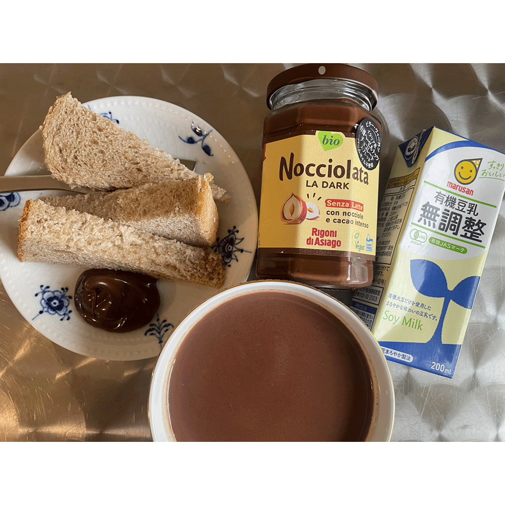 パンに塗るのはもちろん、お湯少々で溶いて温めた牛乳を加えてココアに、牛乳を豆乳に変えてヴィーガンココアにも。