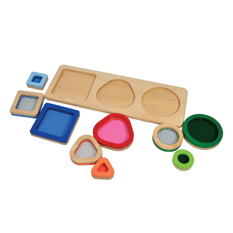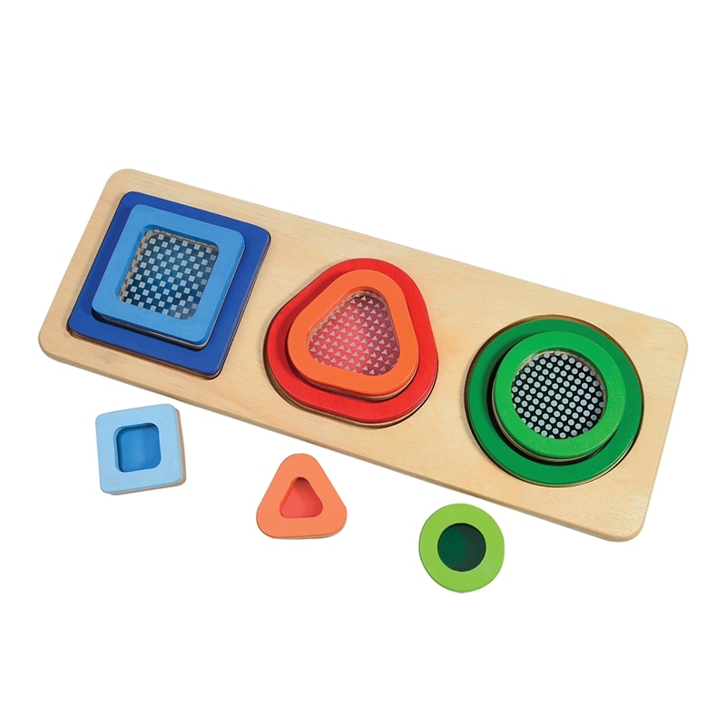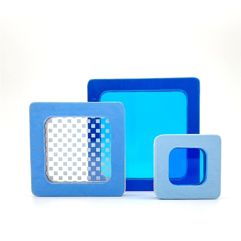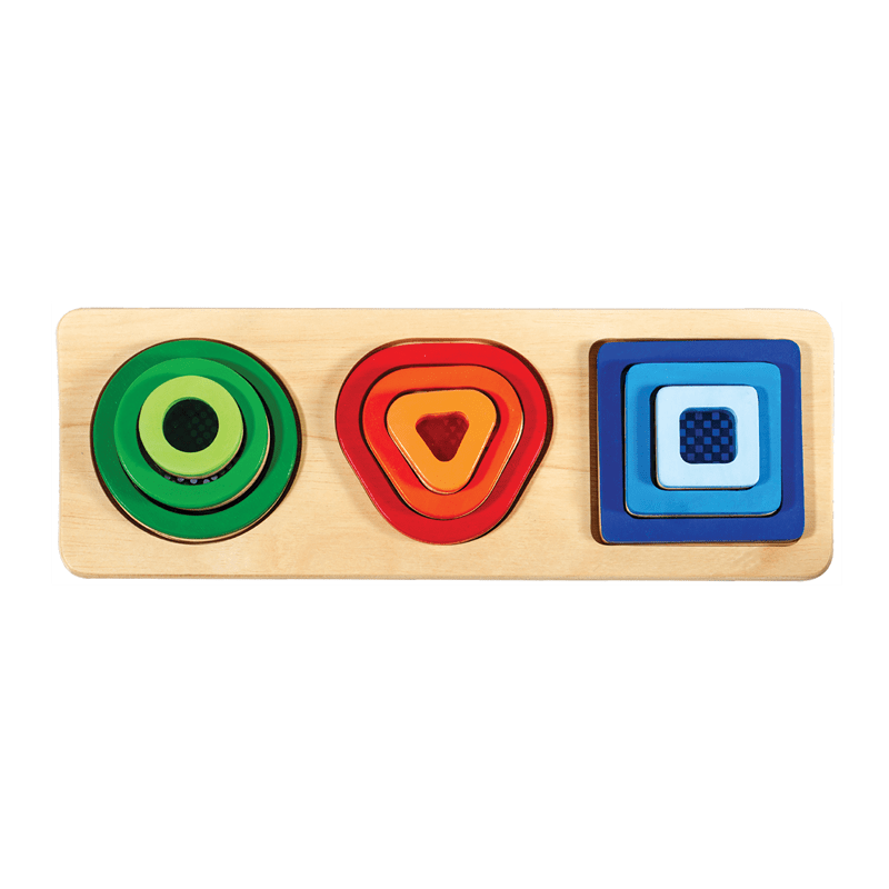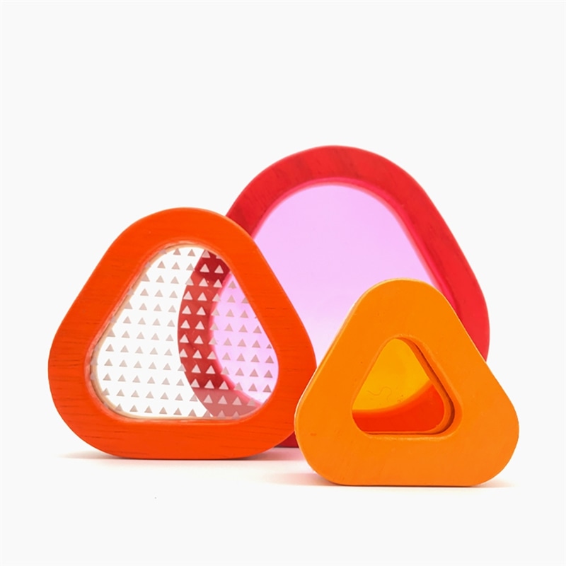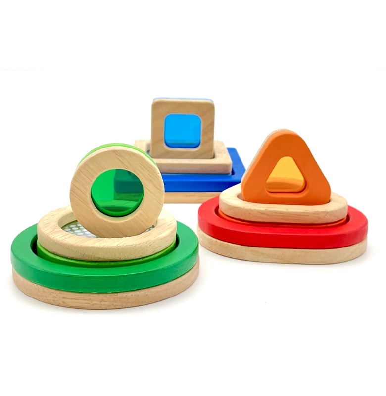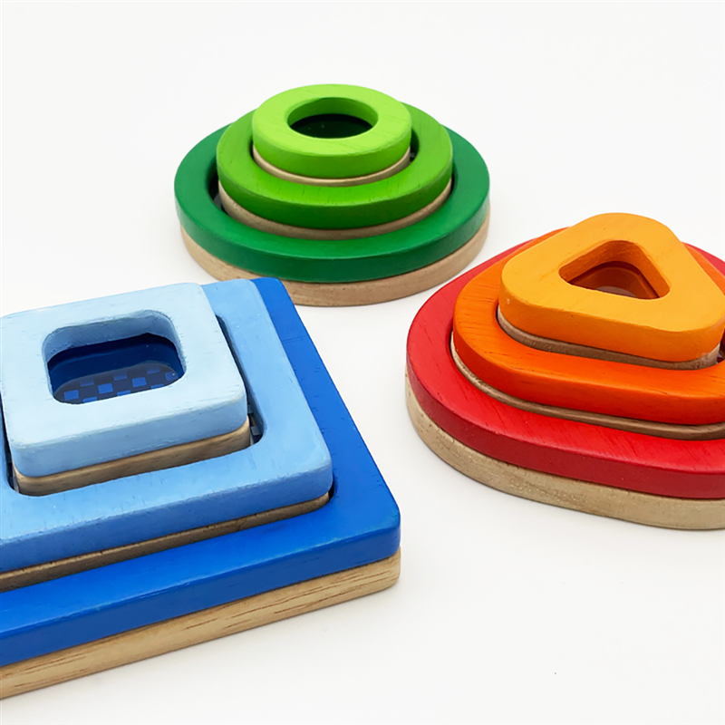 まる・さんかく・しかくの3種類の形で、それぞれ大・中・小の3つを3つ重ねてボードにはめるパズルです。 あそびながら自然と「かたち」や「いろ」、「おおきい・ちいさい」なども体験できます。 パーツは幅約1.6cmと立たせることもできて、光を透すアクリル板が木枠にはめ込まれているのもユニーク! 目にあてて周りを見たり、重ねて色の変化をたのしんだりも…… 型にはめる、重ねる、並べる、積むほかにも、のぞく、色あそびと、自由にあそびを〝試したくなる”おもちゃです。
