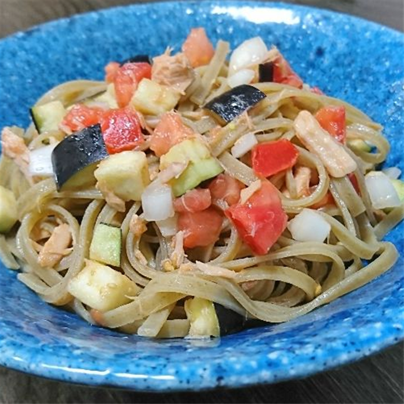 夏野菜で、サラダ・スパゲッティに! 「モロヘイヤライスパスタ」はトマトソース、豆乳クリームソース、オリーヴオイルと塩・胡椒など、スパゲッティのイメージで料理していただければ、おいしくめしあがれます。 写真の料理は、「モロヘイヤライスパスタ」と、みじん切りにした生のトマト・たまねぎ・茄子と、「かもめ屋ライトツナフレーク水煮」を、白ワインヴィネガー、塩、胡椒、オリーヴオイルで作ったドレッシングで和えたものです。 こういったサラダ・スパゲッティ風の食べ方もおすすめです。 (東京店レストラン T)