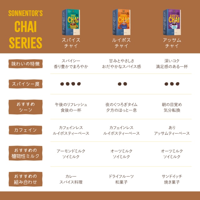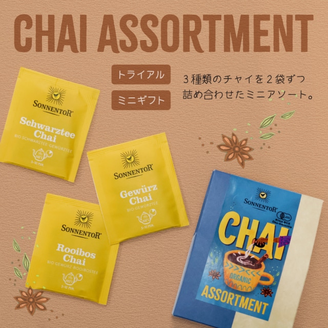 スパイス・ルイボス・アッサム、3種のチャイを詰め合わせたアソート。