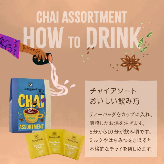 オーガニックスパイスとハーブが香る、ゾネントアオリジナルのチャイブレンドです。