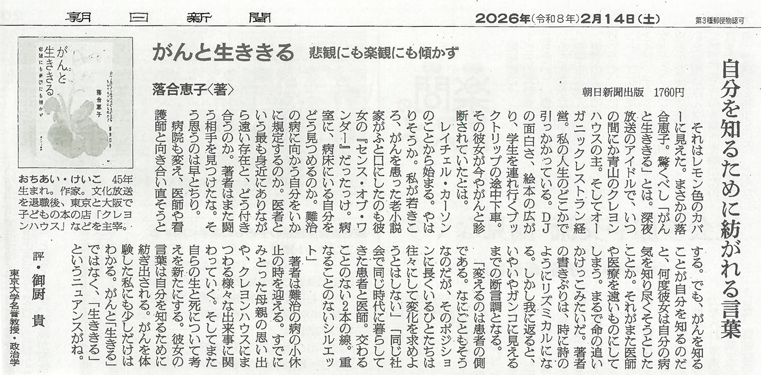 少し前に『明るい覚悟』(2020年単行本、2024年朝日文庫)という加齢をめぐる本を書いた。病に向き合うことも「覚悟」のひとつである。