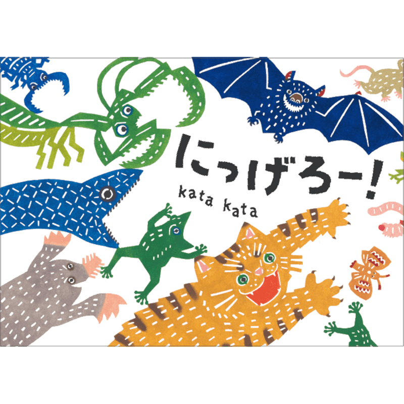 草むらでイモムシのそばに、しのびよる影が。 いったいだれでしょう? シャキーン! するどいカマを持つカマキリです。 捕まらないように、にっげろー! アリが歩く道の先にも、待ち構えているあやしいやつ。 地面の中から飛び出したのは、アリジゴクだ、にっげろー! 身近に暮らす生きものたちがくり広げる、はらはらどきどきの追いかけっこを、コミカルに描きます。 型紙にそって糊を置き、染まる部分と染まらない部分を作って、模様や絵を染め出す、日本の伝統的技法「型染め」をつかった、染色作家ユニット・kata kataさんによる絵本です。