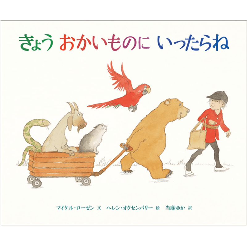 『きょうはみんなでクマがりだ』のコンビによる、ことばあそびがかくれたユーモア絵本。お買いものにでかけた男の子。 八百屋でニンジン(c a r r o t)を買おうとしますが、渡されたのは、オウム(p a r r o t)。帽子屋で帽子(h a t)を買おうとすると、ネコ(c a t)を渡されます。増えていく動物たちを引き連れて、買いものを続けますが、やがて動物たちが大さわぎをはじめて……。 英語版もほしくなる、じつは英語の韻が起因の作品。