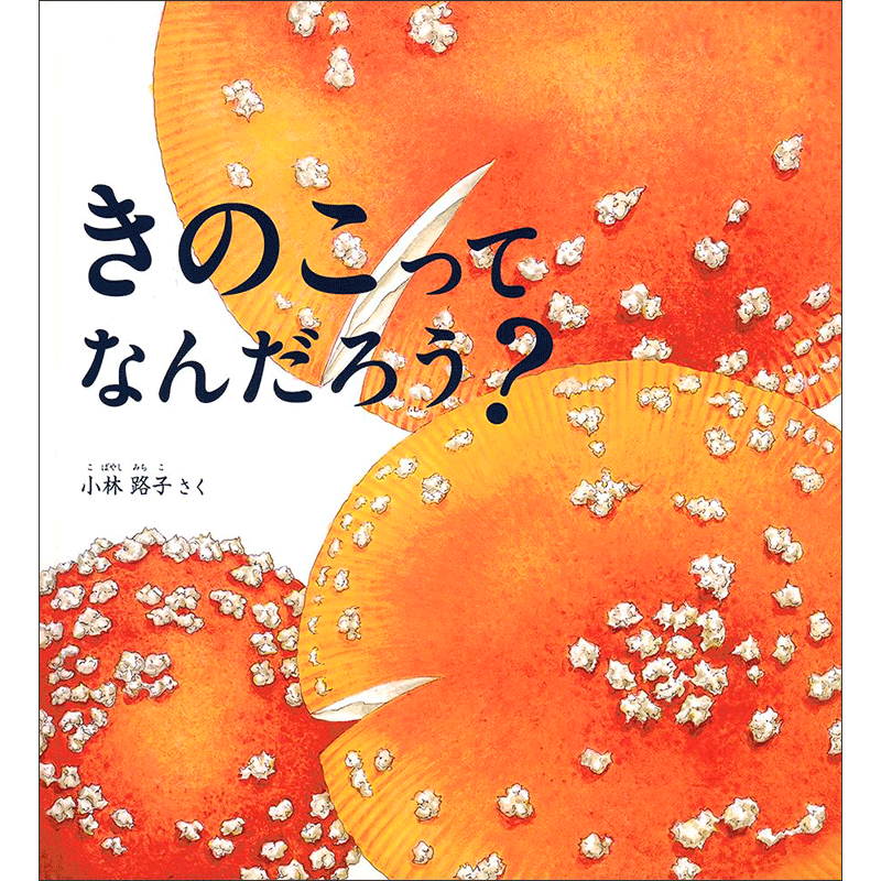 森の小道にあるに生えている白樺の木の下、青々としたコケからふたつ、赤い何かがひょっこり出ています。 これは「ベニテングダケ」。 キノコの笠の下にあるひだから、ひとつひとつは目には見えないくらいのちいさな胞子が風に乗って飛び、その胞子が地面に落ちると菌糸になって……。 「ベニテングダケ」の一生や、生きた木の根や落ち葉など、生息する場所に分けてたくさんの種類のキノコを紹介。 長年キノコを描き続けている小林路子さんが、ほぼすべてのキノコを原寸大の大きさで色鮮やかに描いています。