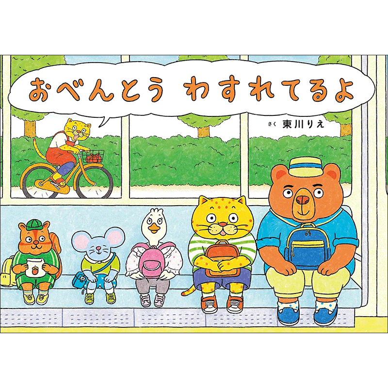 今日は待ちに待った遠足の日。 チーターのちいたくんは、元気に家を出ていきましたが…。 玄関の外でちいたくんのお見送りをすませたおかあさんが 家の中に戻ると……大変! ちいたくんのおべんとうがそこに!! おかあさん、ちいたくんを走って追いかけます。 「おべんとうわすれてるよ~」 残念! ひとあしおそく、ちいたくんはお友だちと一緒に電車に乗って行ってしまいました。 自転車に乗ってちいたくんを追いかけるおかあさん。 一方、 ちいたくんは電車の窓の向こうで必死に自転車を漕いでいるおかあさんには一向に気づきません。 ヒッチハイクのトラックに、ボート、バイク、ウマに気球など、電車が進んでいくたびに、乗りものを乗り換えてちいたくんを追いかけるダイナミックなおかあさんから目が離せません!