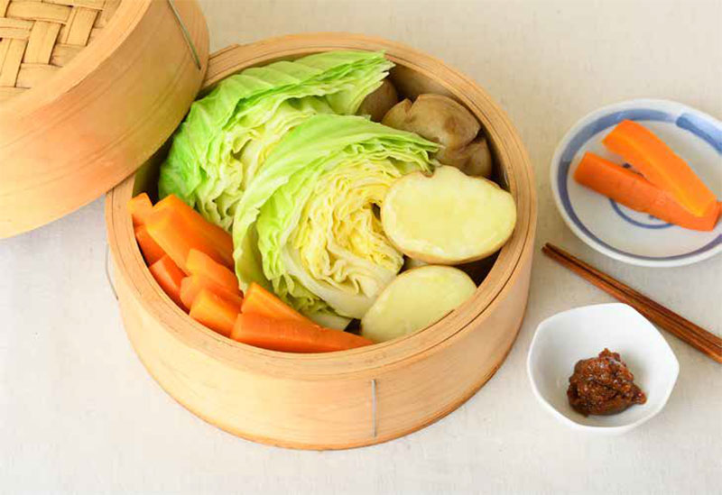 1:カットしたにんじんとじゃがいもをせいろにいれ、中火で10-15分蒸す。キャベツを加えて、さらに5分ほど蒸す。竹串で刺して固さをみてできあがり。