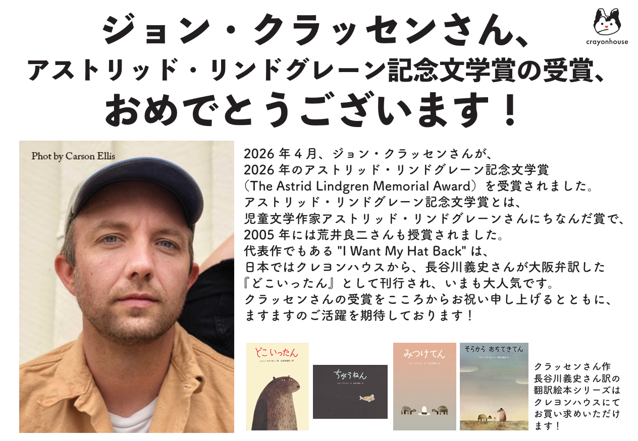 2026年4月、ジョン・クラッセンさんが、 2026年のアストリッド・リンドグレーン記念文学賞 (The Astrid Lindgren Memorial Award)を受賞されました。 代表作でもある"I Want My Hat Back"は、 日本ではクレヨンハウスから、長谷川義史さんが大阪弁訳した 『どこいったん』として刊行され、いまも大人気です。 クラッセンさんの受賞をこころからお祝い申し上げるとともに、 ますますのご活躍を期待しております。 アストリッド・リンドグレーン記念文学賞 The Astrid Lindgren Memorial Award 児童文学作家アストリッド・リンドグレーンさんにちなんだ賞で、 2005年には荒井良二さんも授賞されました。